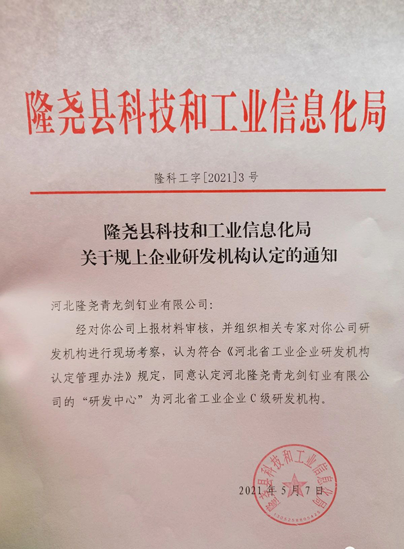 經(jīng)對你公司上報材料審核, 并組織相關(guān)專家對你公司研發(fā)機構(gòu)進行現(xiàn)場考察, 認為符合 《河北省工業(yè)企業(yè)研發(fā)機構(gòu)認定管理辦法》規(guī)定,同意認定河北隆堯青龍劍釘業(yè)有限公司的 "研發(fā)中心" 為河北省工業(yè)企業(yè)C 級研發(fā)機構(gòu)。